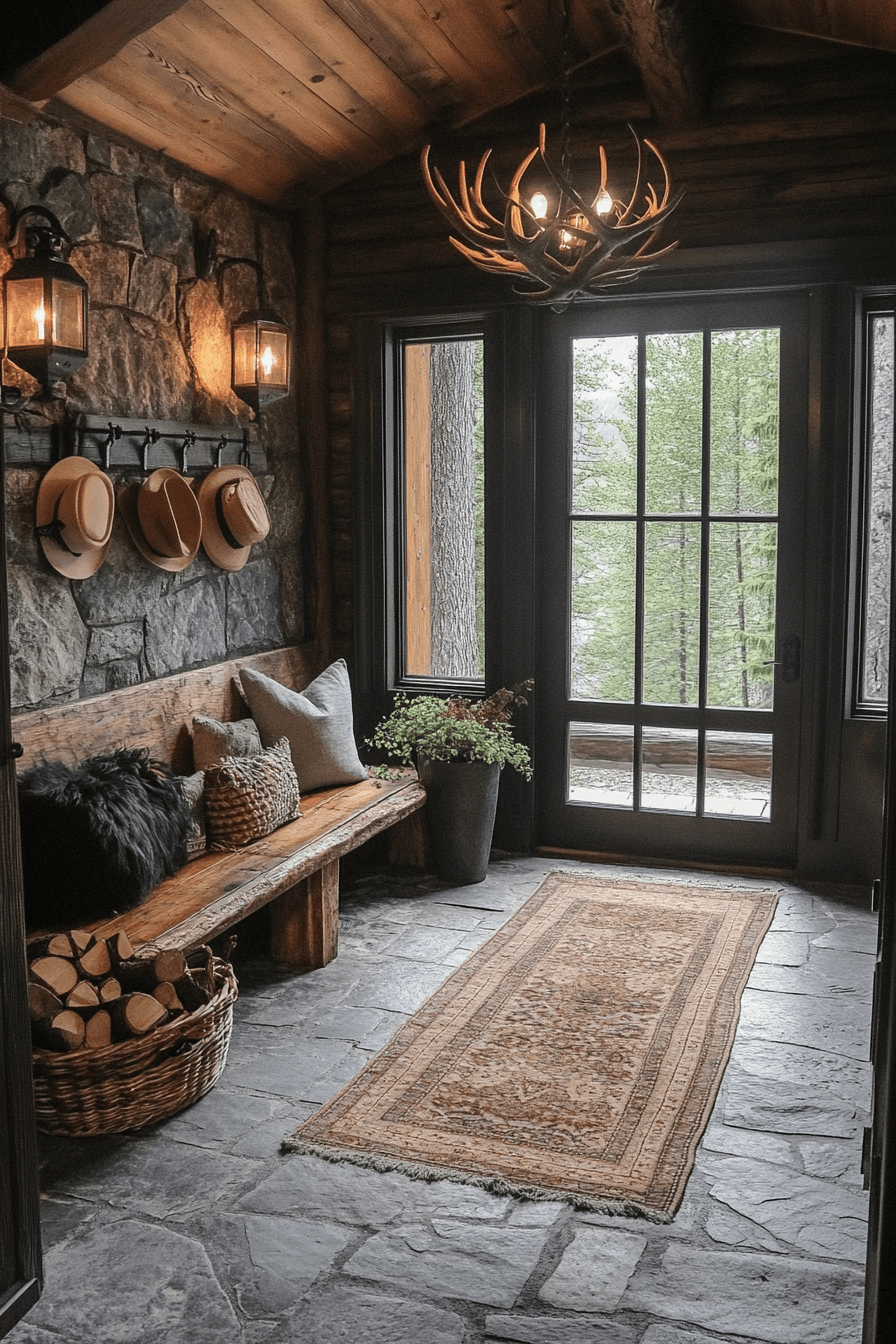 Step through the door into nature’s embrace with little cabin decor that welcomes guests in style. Stones, wood benches, and greenery set a warm and authentic tone. Antler hooks and woven mats offer function with rustic flair. Natural light and soft textures complete the inviting entryway.