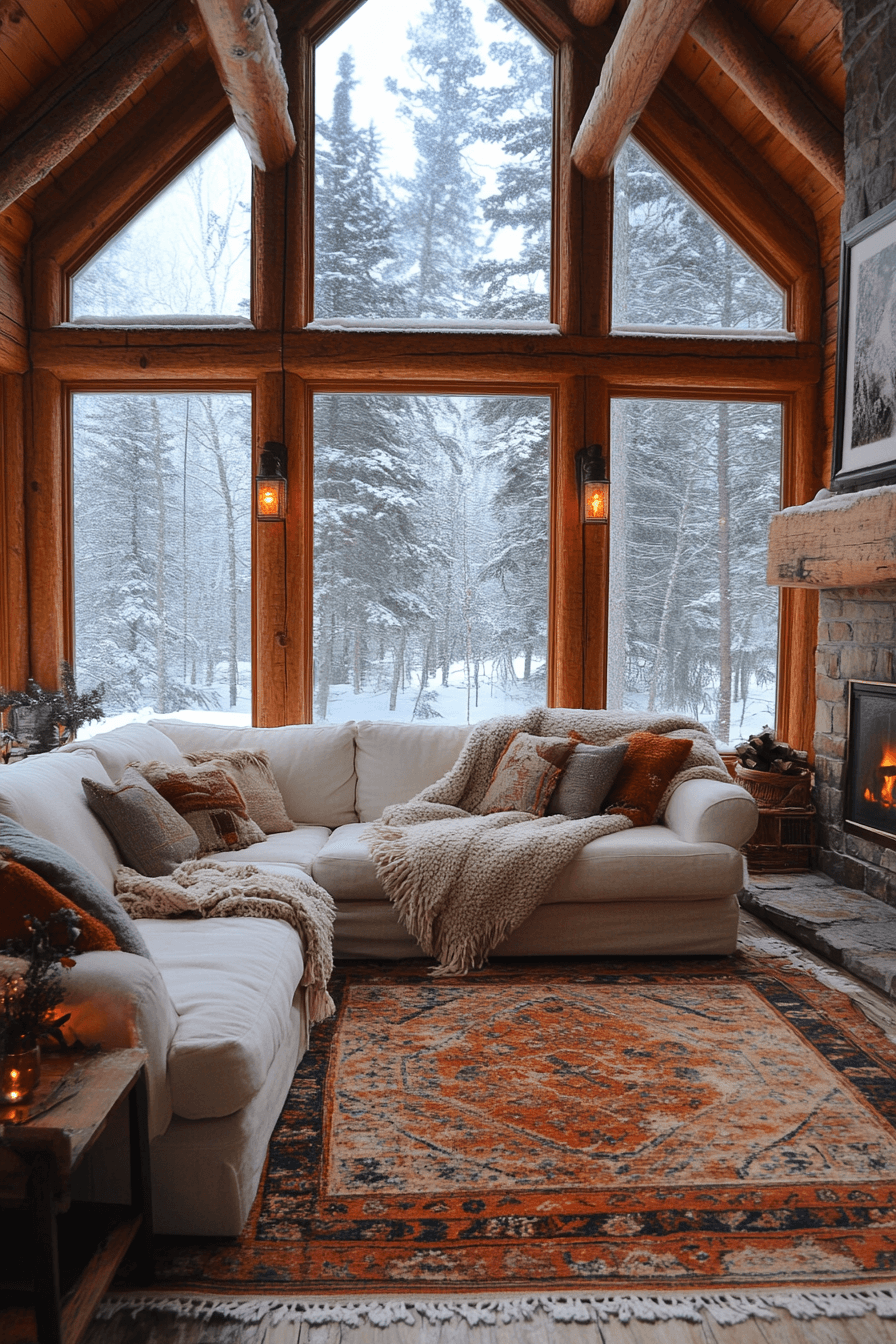 Snowy nights come alive in this dreamy little cabin living room built for winter warmth. Faux fur blankets, soft rugs, and a glowing fire create an irresistible cocoon of comfort. Dark woods and ambient lighting enhance the snug, peaceful vibe. It’s a snow-day sanctuary you’ll never want to leave.