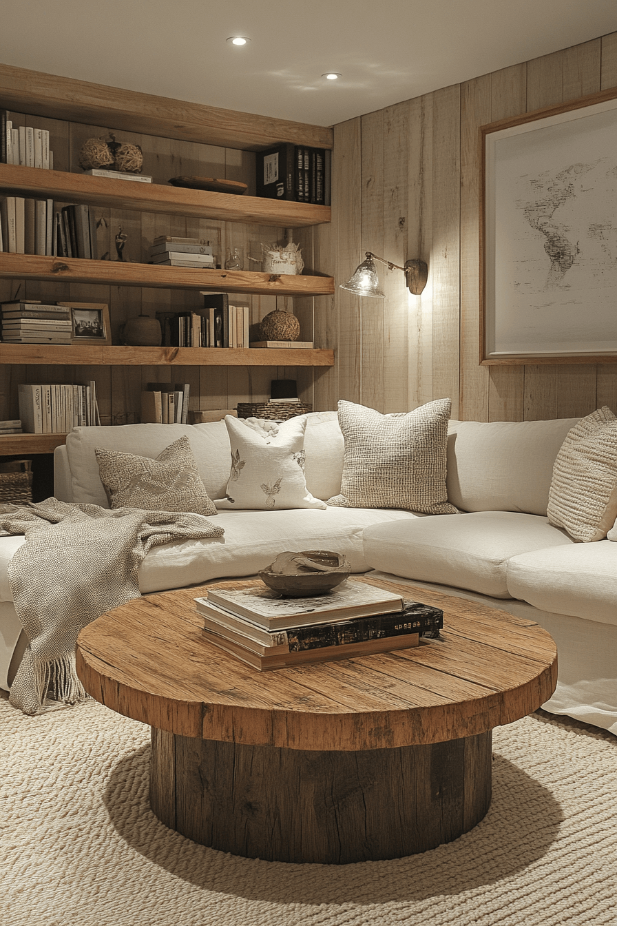 Warm tones and natural wood textures bring heart to this little cabin living room. From rustic beams to handcrafted furniture, every surface glows with earthy charm. The neutral palette enhances the warmth, creating a peaceful retreat after a long day. Cozy lighting ties everything together in golden harmony.