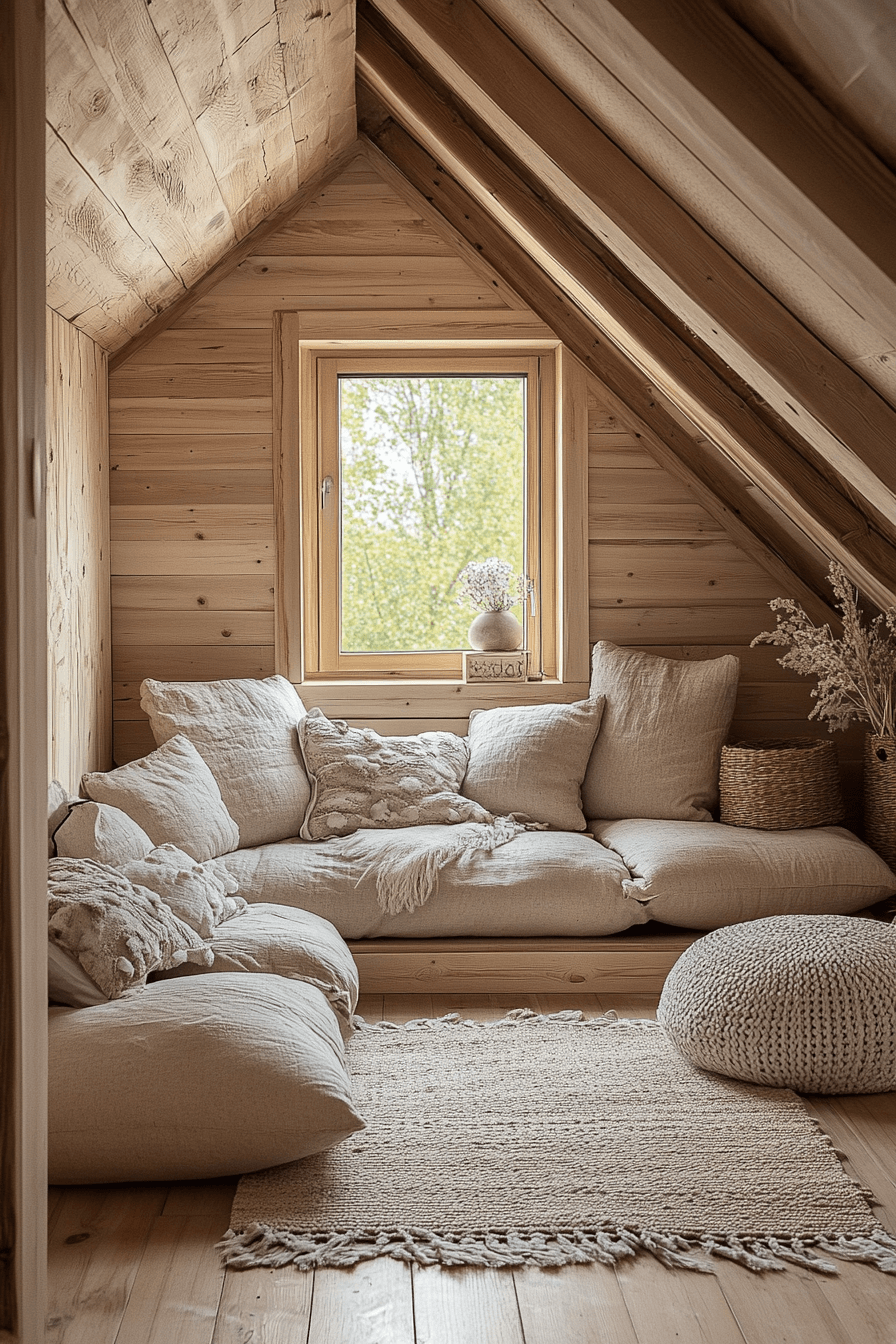 This loft-style little cabin living room transforms vertical space into a cozy hideaway. Skylights pour sunlight onto exposed wood beams, making the room feel both intimate and bright. Minimalist furniture keeps the design clean and open. It’s an elevated escape perfect for quiet afternoons.