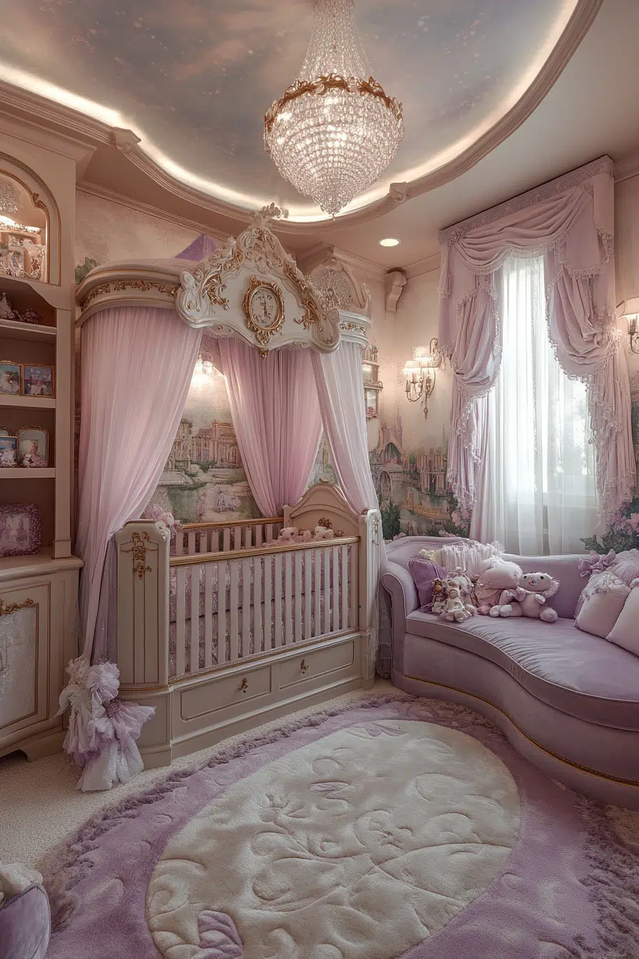 Create a magical space with the Enchanted Fairy Princess Haven, where your little girl’s nursery becomes a fairy tale. Use a palette of soft pinks and purples, with sparkling touches and plush materials to foster a dreamlike setting. A crib canopy with flowing fabrics adds a magical focal point, while princess-themed decor brings the story to life.