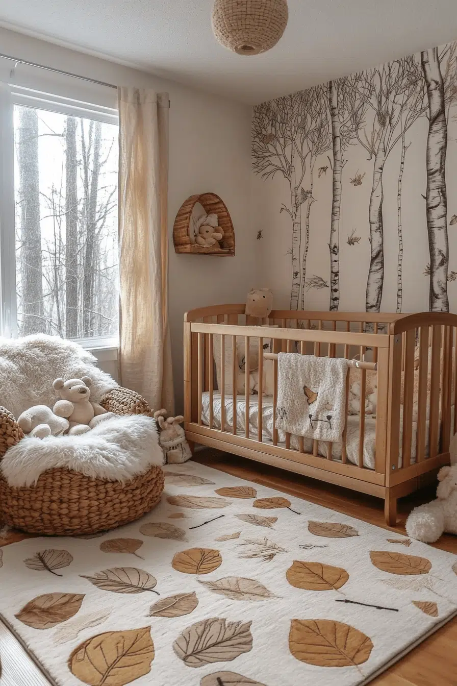 Bring nature indoors with nursery room ideas featuring earthy tones and wooden touches for a calm vibe. Affordable forest animal toys and green fabrics create a soothing, budget-friendly haven. Soft lights and leaf patterns from thrift finds spark your baby’s imagination.
