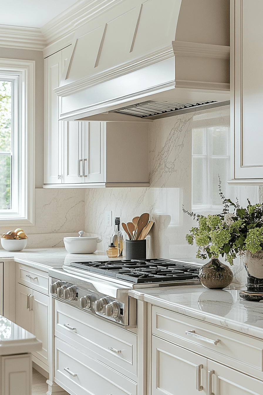 Cool gray undertones can bring a refined edge to elegant off white kitchen cabinets. This subtle variation keeps the space feeling bright while adding a modern layer of sophistication. Many designers love pairing off white kitchen cabinets with marble countertops, silver hardware, and sleek tile backsplashes. The cooler tone complements both dark and light accents beautifully. The overall kitchen atmosphere feels calm, contemporary, and incredibly polished. Discover stylish off white kitchen cabinets with cool undertones that elevate modern kitchens!