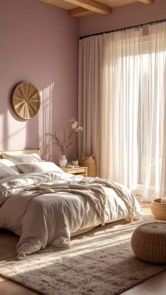 Modern Minimalism in Mauve combines the soft elegance of muted mauve walls with the simplicity of streamlined furniture in white or gray tones. The color palette exudes tranquility, while geometric patterns in throw pillows or area rugs introduce understated visual interest. Abstract wall art and a sleek table lamp complete the look, keeping the decor minimal yet impactful.