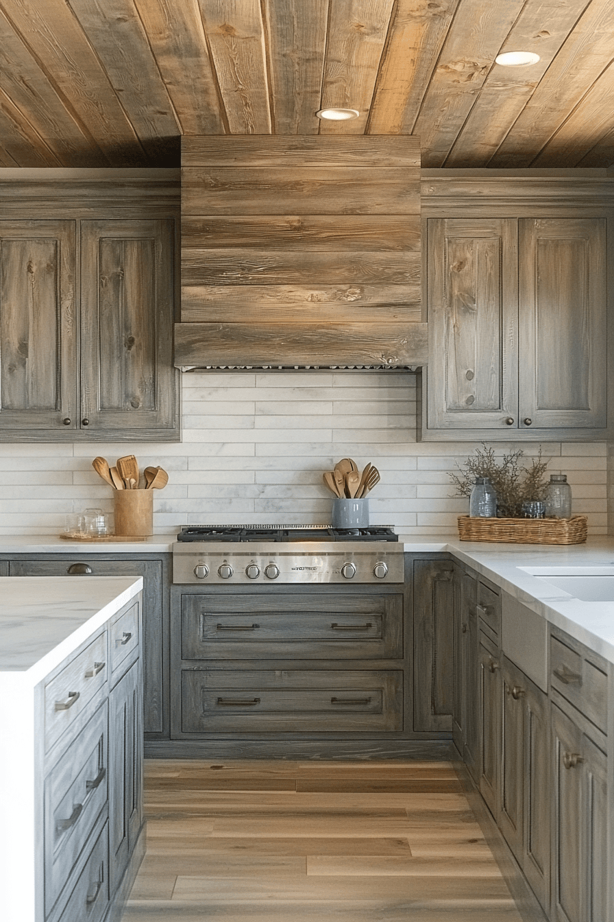 Soft driftwood gray tones introduce a relaxed coastal influence to stylish rustic kitchen cabinets. The weathered gray shades create a soothing palette that feels calm and natural. These cabinets pair wonderfully with white quartz counters, stone backsplashes, and organic decor. The overall look feels airy yet grounded, perfect for modern rustic living. Rustic kitchen cabinets in driftwood tones bring both elegance and laid-back charm into the kitchen. Explore more beautiful driftwood-inspired cabinet ideas for your home.