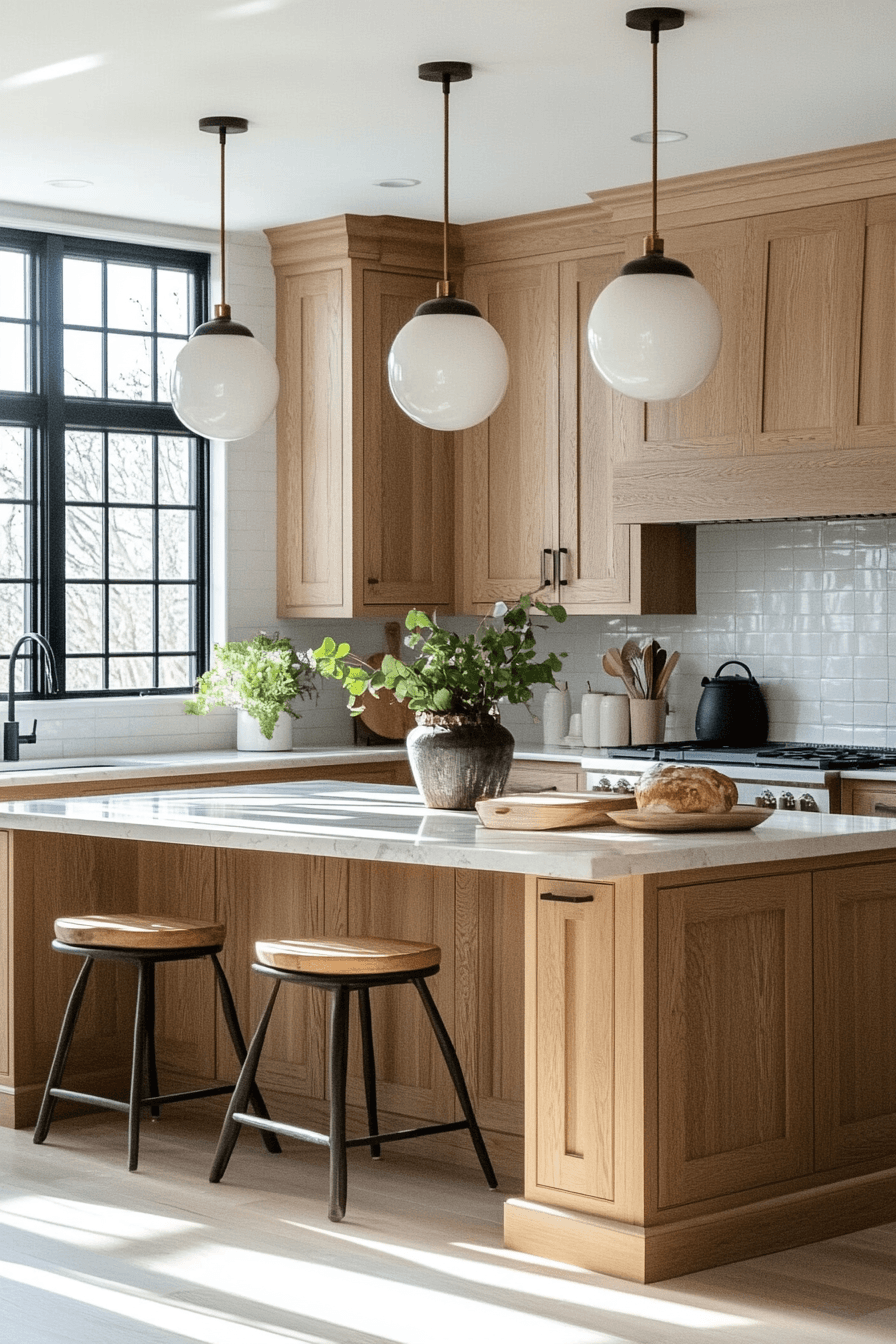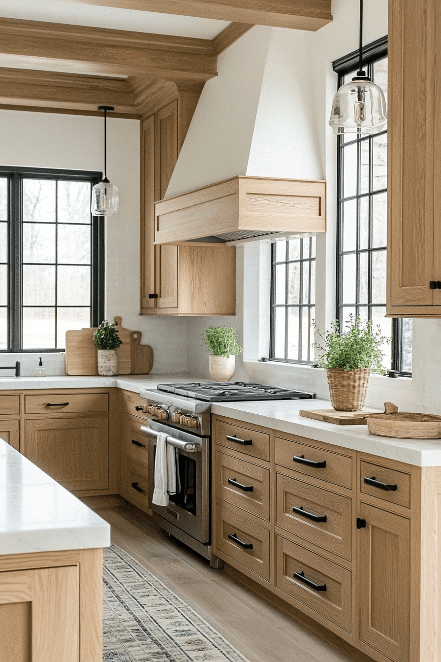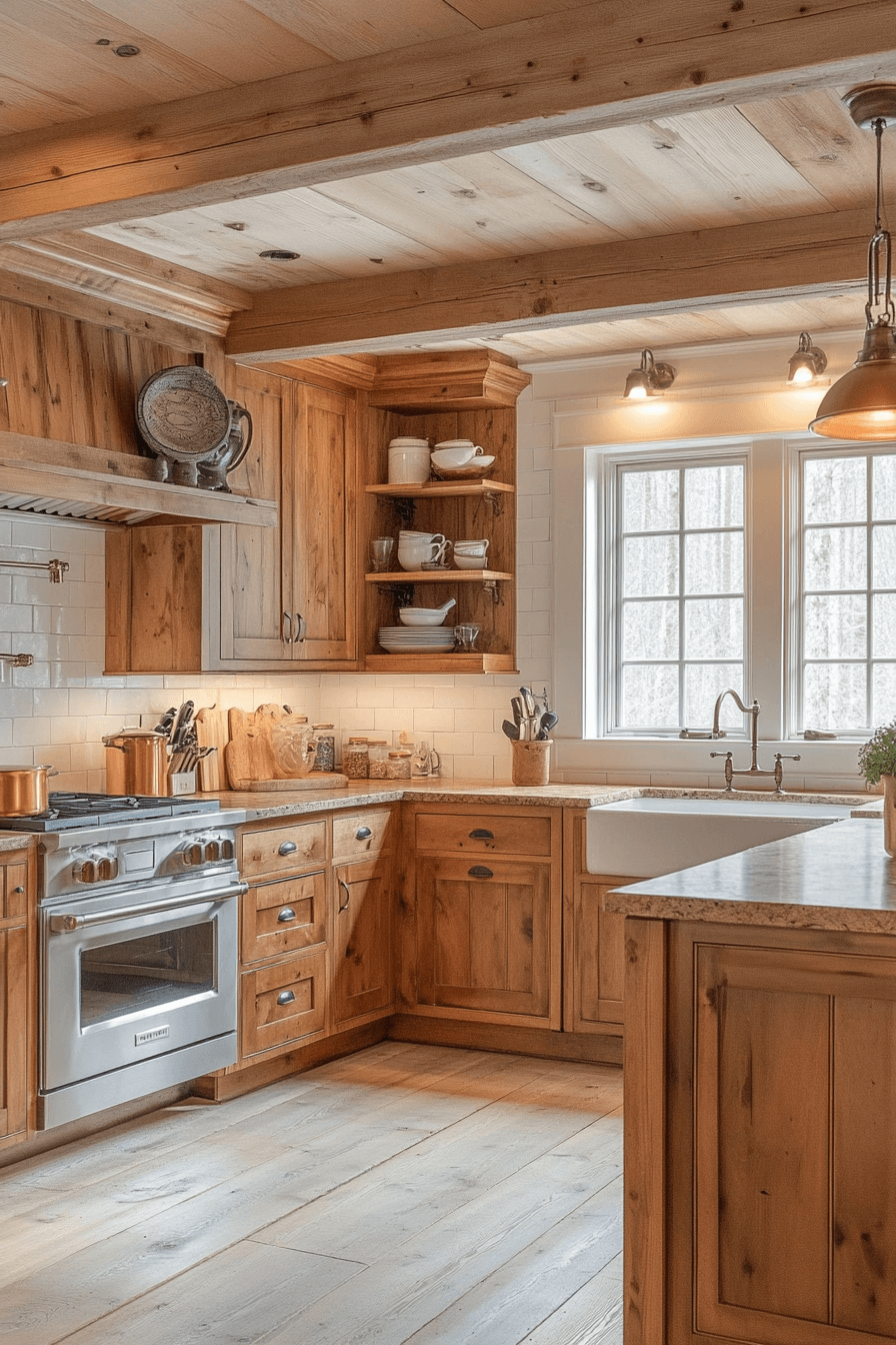 Light oak finishes offer a fresh twist on classic rustic kitchen cabinets. The soft, pale wood tones keep the kitchen feeling bright while still highlighting the natural beauty of the grain. This look pairs effortlessly with white walls, stone counters, and copper or matte black accents. The result feels airy yet grounded in rustic warmth. These rustic kitchen cabinets work beautifully with both farmhouse and Scandinavian-inspired spaces. Take a closer look at how light oak can redefine rustic style.