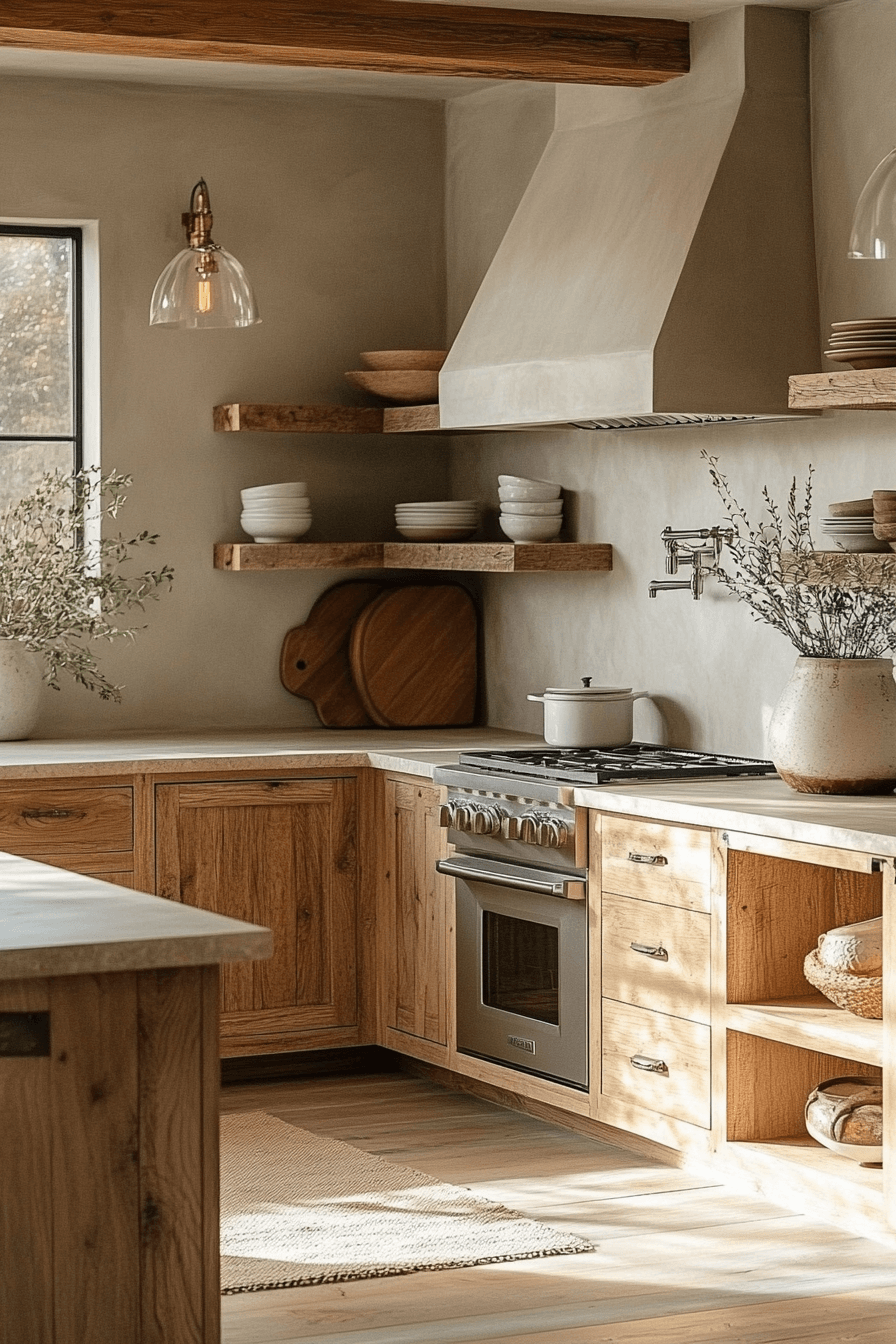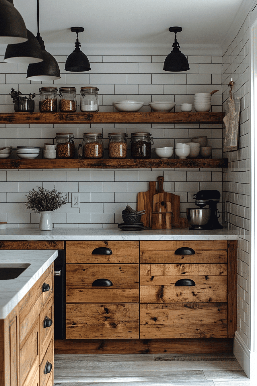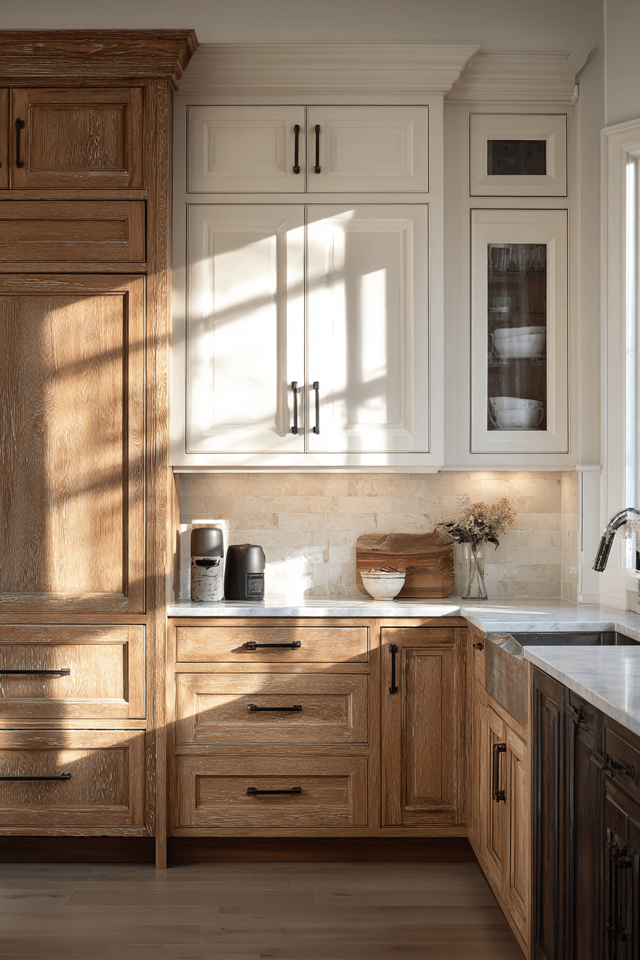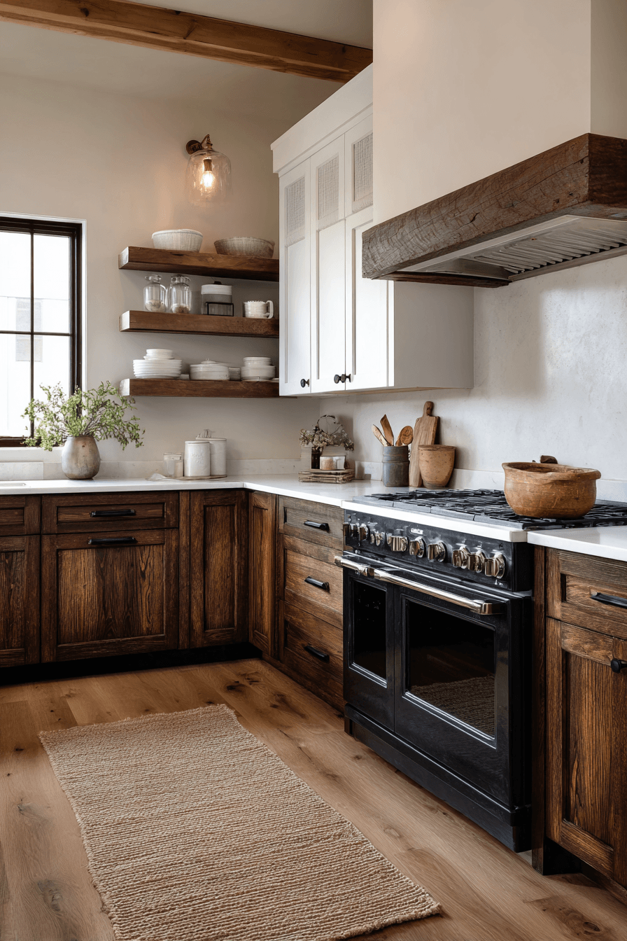 Mixing wood tones adds beautiful depth and personality to thoughtfully styled rustic kitchen cabinets. Darker lower cabinets paired with lighter upper finishes create natural contrast and visual interest. This layered approach keeps the kitchen feeling dynamic rather than flat. The combination also highlights architectural features and complements open concept spaces. Rustic kitchen cabinets with varied wood tones feel artistic, curated, and welcoming. Explore more creative ways to combine wood tones in rustic kitchens.