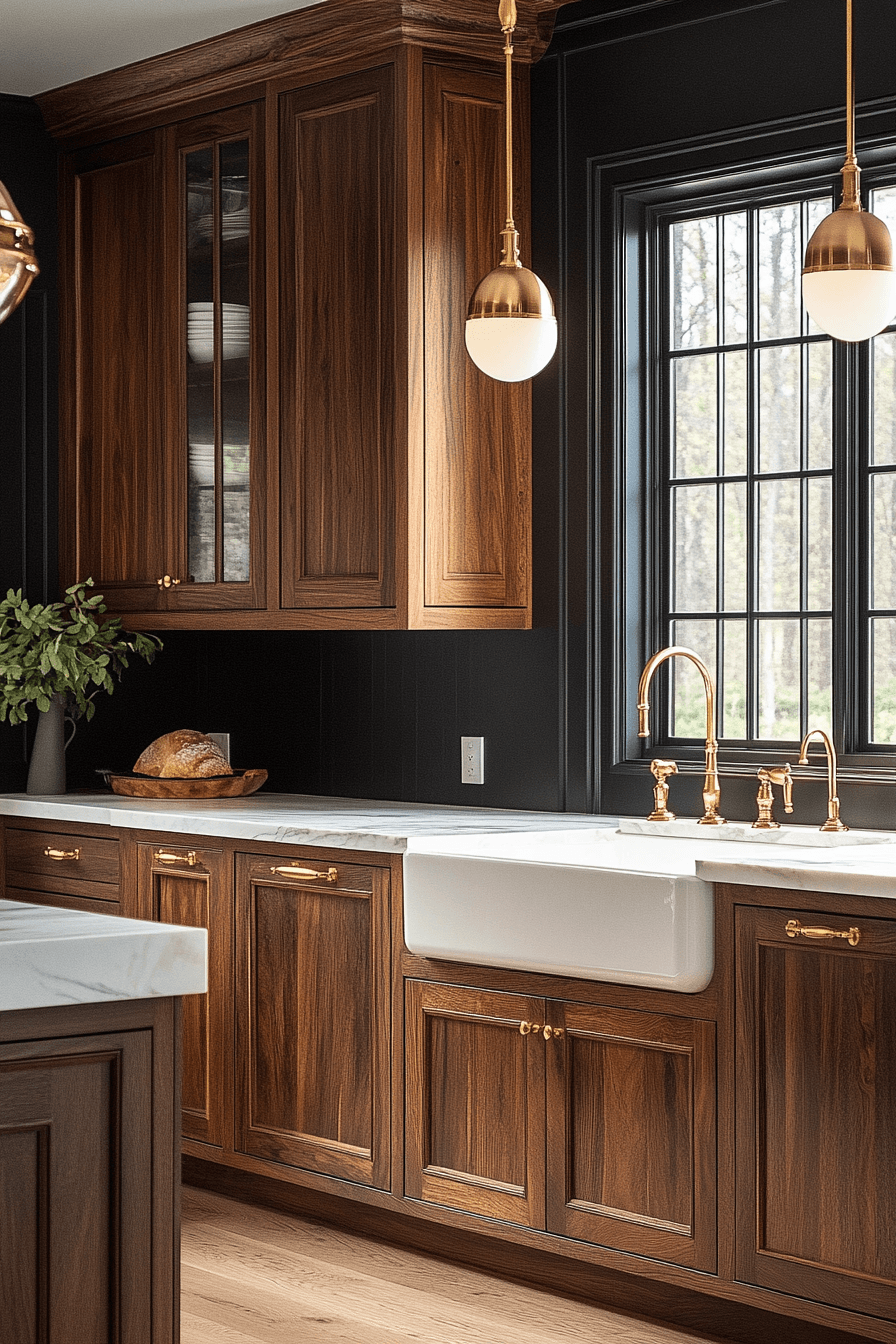 Rich walnut finishes bring a sophisticated twist to classic rustic kitchen cabinets. The deep chocolate tones add dramatic warmth and elegance to the entire space. Walnut pairs beautifully with brass hardware, marble countertops, and soft ambient lighting. The bold color contrast enhances the natural beauty of the wood while elevating the overall design. These rustic kitchen cabinets feel luxurious yet grounded in organic style. Take a look at how dark walnut cabinetry can transform your kitchen.