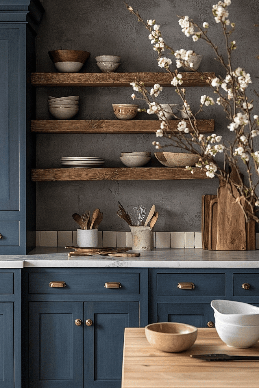 Soft blue accents introduce refreshing personality to charming rustic kitchen cabinets. Shades like muted navy, slate, or dusty denim add depth without overpowering the rustic aesthetic. These tones blend beautifully with natural wood, brass hardware, and creamy neutral surfaces. The color evokes calm countryside charm while keeping the kitchen feeling fresh and modern. Rustic kitchen cabinets with blue accents feel welcoming and wonderfully unique. Find inspiration for incorporating beautiful rustic blues into your kitchen design.