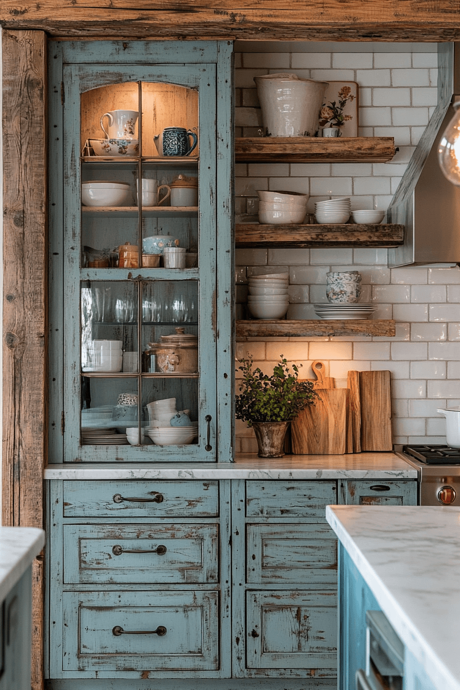 Glass-front doors add lightness and elegance to thoughtfully styled rustic kitchen cabinets. Framed with distressed or reclaimed wood, they keep the rustic charm while allowing glimpses of what’s inside. These cabinets are perfect for showcasing pottery, spices, or heirloom dishware. The glass breaks up the visual weight of solid cabinetry, making the kitchen feel more open. Seeded or frosted glass adds even more rustic character to the design. Explore ways to style glass-front rustic kitchen cabinets beautifully.