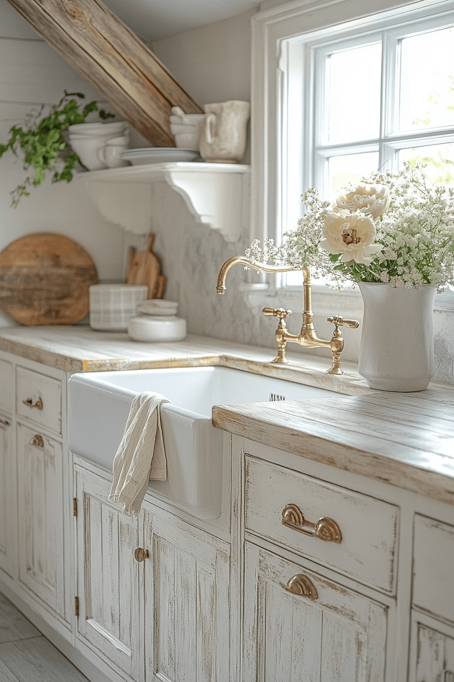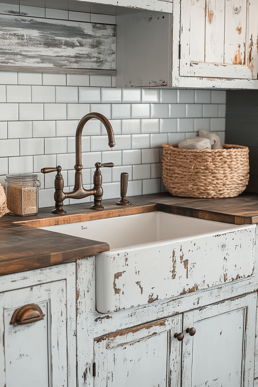 A distressed white finish adds brightness and vintage charm to beautiful rustic kitchen cabinets. The softly worn paint and subtle aging reveal hints of natural wood beneath the surface. This creates a layered look that feels both nostalgic and timeless. Paired with black iron handles or open wooden shelving, the kitchen feels balanced and inviting. Rustic kitchen cabinets in distressed white make the space feel airy while keeping the warmth of farmhouse design. Take a moment to explore more ideas for bright rustic kitchen cabinets.
