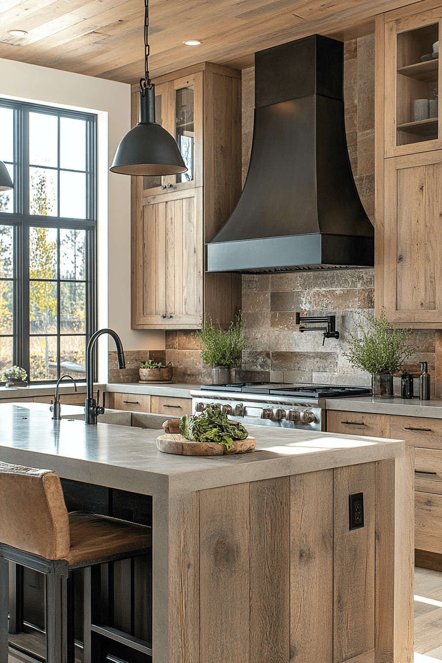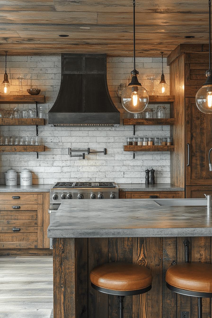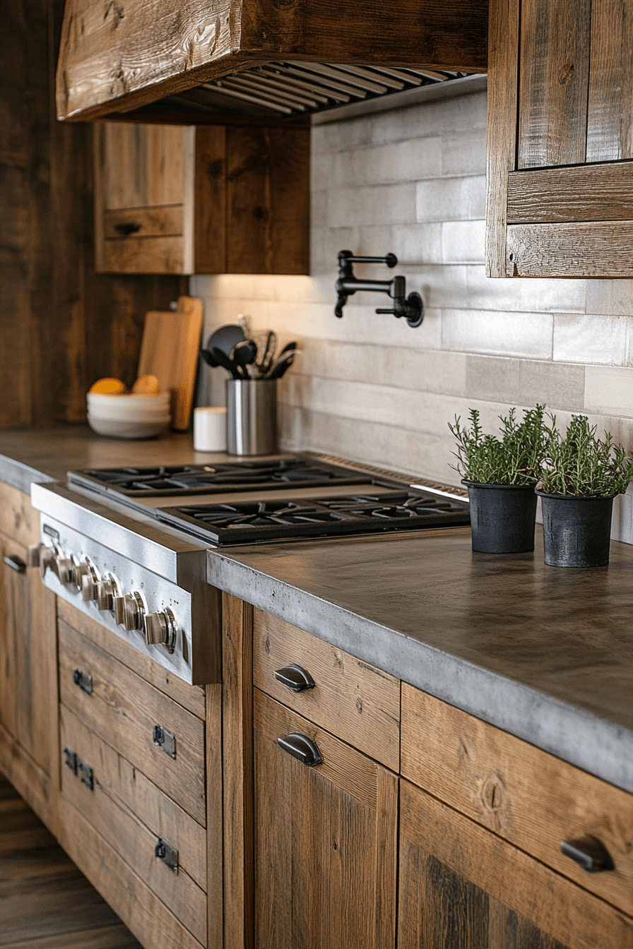 Concrete surfaces offer a cool, modern contrast when paired with rustic kitchen cabinets. The neutral gray tones and raw texture make the warmth of the wood stand out even more. This pairing creates a dynamic balance between rugged and refined materials. It works especially well in kitchens that blend rustic charm with industrial style. Rustic kitchen cabinets bring softness and warmth that perfectly complement concrete’s bold presence. Discover the striking harmony of wood and concrete kitchen design.