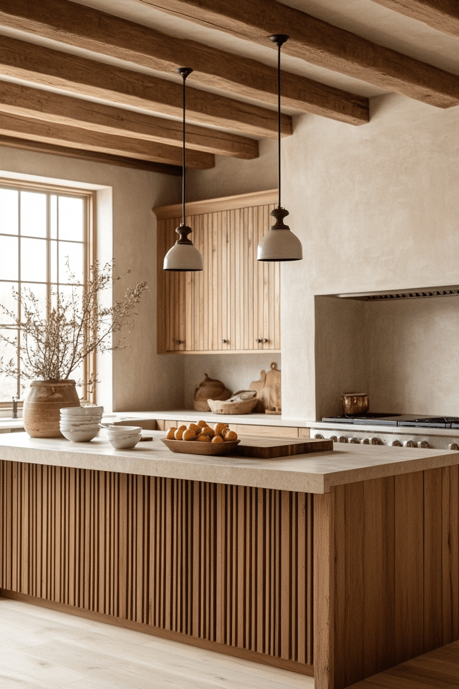 Slatted cabinet fronts introduce subtle architectural texture to eye-catching rustic kitchen cabinets. Horizontal or vertical wood slats create a rhythmic pattern that adds depth and movement. This design detail blends beautifully with styles like modern farmhouse or Japandi-inspired kitchens. Natural wood tones highlight the shadows and dimension created by the slats. Rustic kitchen cabinets with this feature feel structured yet warm and organic. See how slatted wood designs can transform rustic cabinetry.