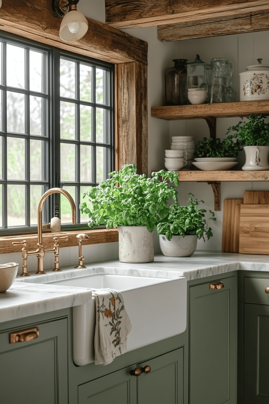 Earth-inspired greens bring refreshing life to charming rustic kitchen cabinets. Shades like olive, sage, or forest green blend beautifully with natural wood grains and brass details. The color palette feels grounded and peaceful while still offering a modern pop of personality. Combined with stone floors, open shelves, and vintage lighting, the kitchen becomes warm and inviting. These rustic kitchen cabinets capture the calm beauty of nature inside your home. Discover more inspiring green cabinet ideas for rustic kitchens.