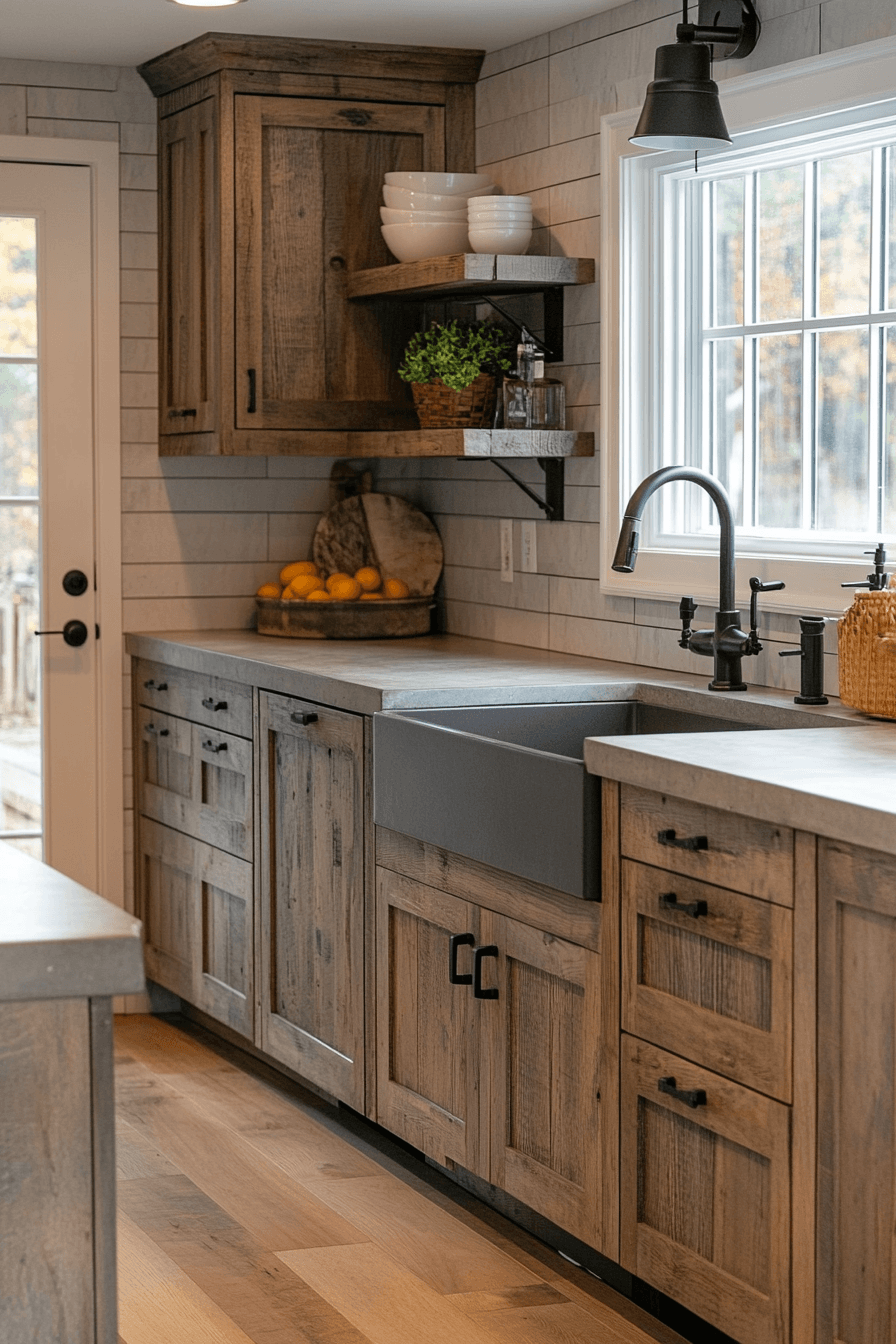 Concrete surfaces offer a cool, modern contrast when paired with rustic kitchen cabinets. The neutral gray tones and raw texture make the warmth of the wood stand out even more. This pairing creates a dynamic balance between rugged and refined materials. It works especially well in kitchens that blend rustic charm with industrial style. Rustic kitchen cabinets bring softness and warmth that perfectly complement concrete’s bold presence. Discover the striking harmony of wood and concrete kitchen design.
