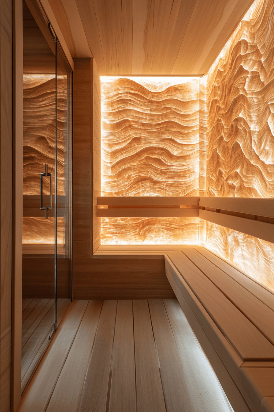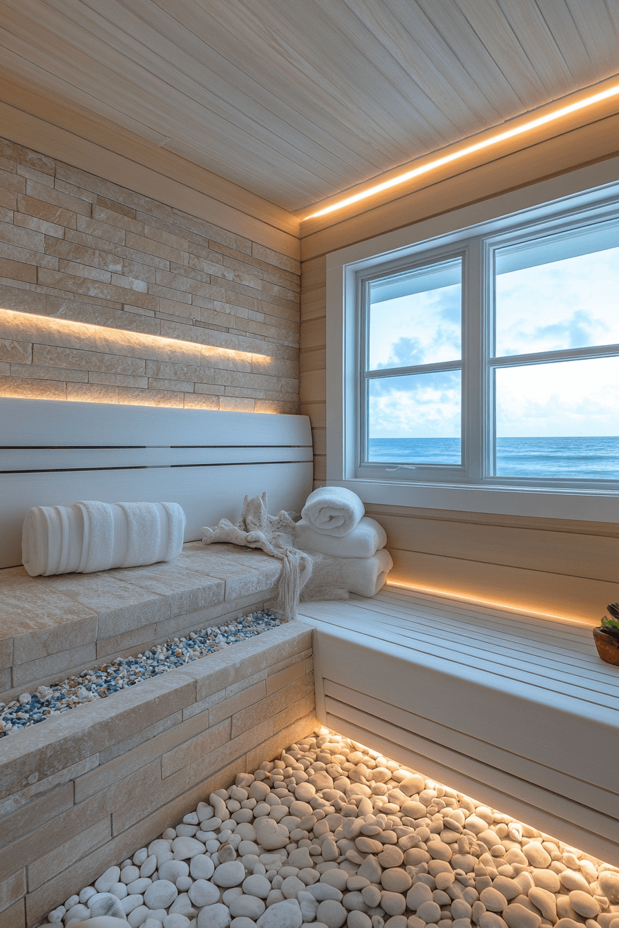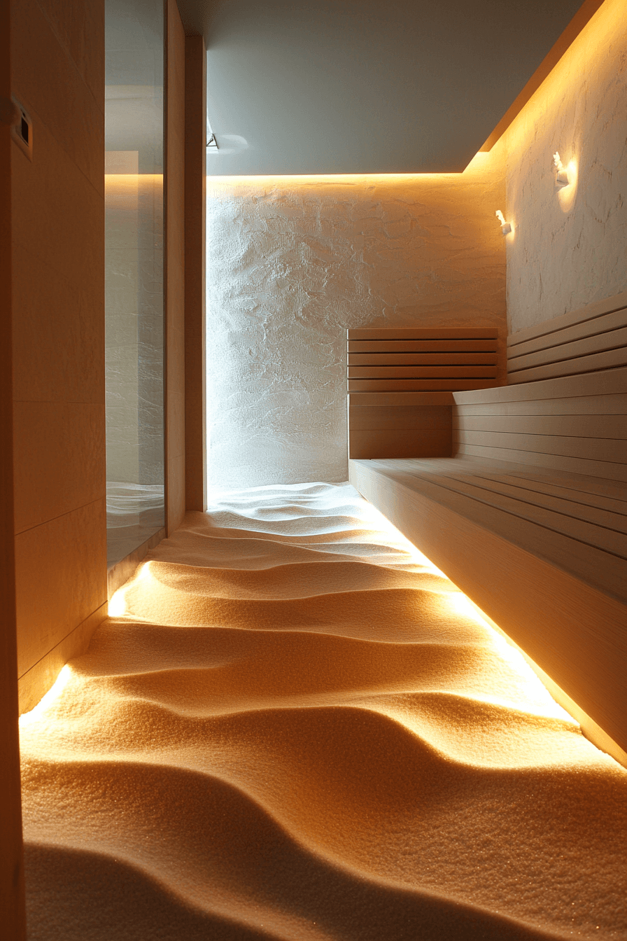 Textured flooring introduces a unique twist to creative sauna ideas that focus on tactile wellness. A layer of sand beneath your feet adds a soothing, massage-like sensation during each session. The combination of heat and texture enhances relaxation while offering gentle exfoliation. Natural materials like wood and stone complement the beach-inspired design beautifully. These sauna ideas bring a fresh, sensory dimension to traditional sauna use. Experience the benefits of sand therapy through innovative sauna ideas.