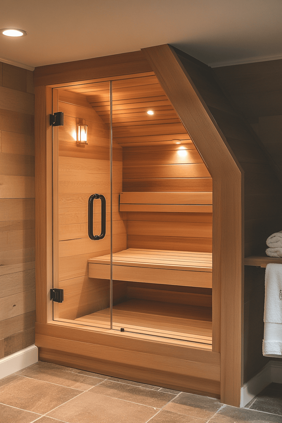 Creative use of small spaces makes compact sauna ideas both practical and stylish. An under-the-stairs layout turns unused areas into a functional wellness retreat. Custom wood panels and compact heaters maximize every inch efficiently. Foldable seating and sliding doors help maintain flexibility and comfort. Strategic lighting ensures the space feels open rather than confined. See how clever sauna ideas can transform even the smallest corners into relaxing escapes.