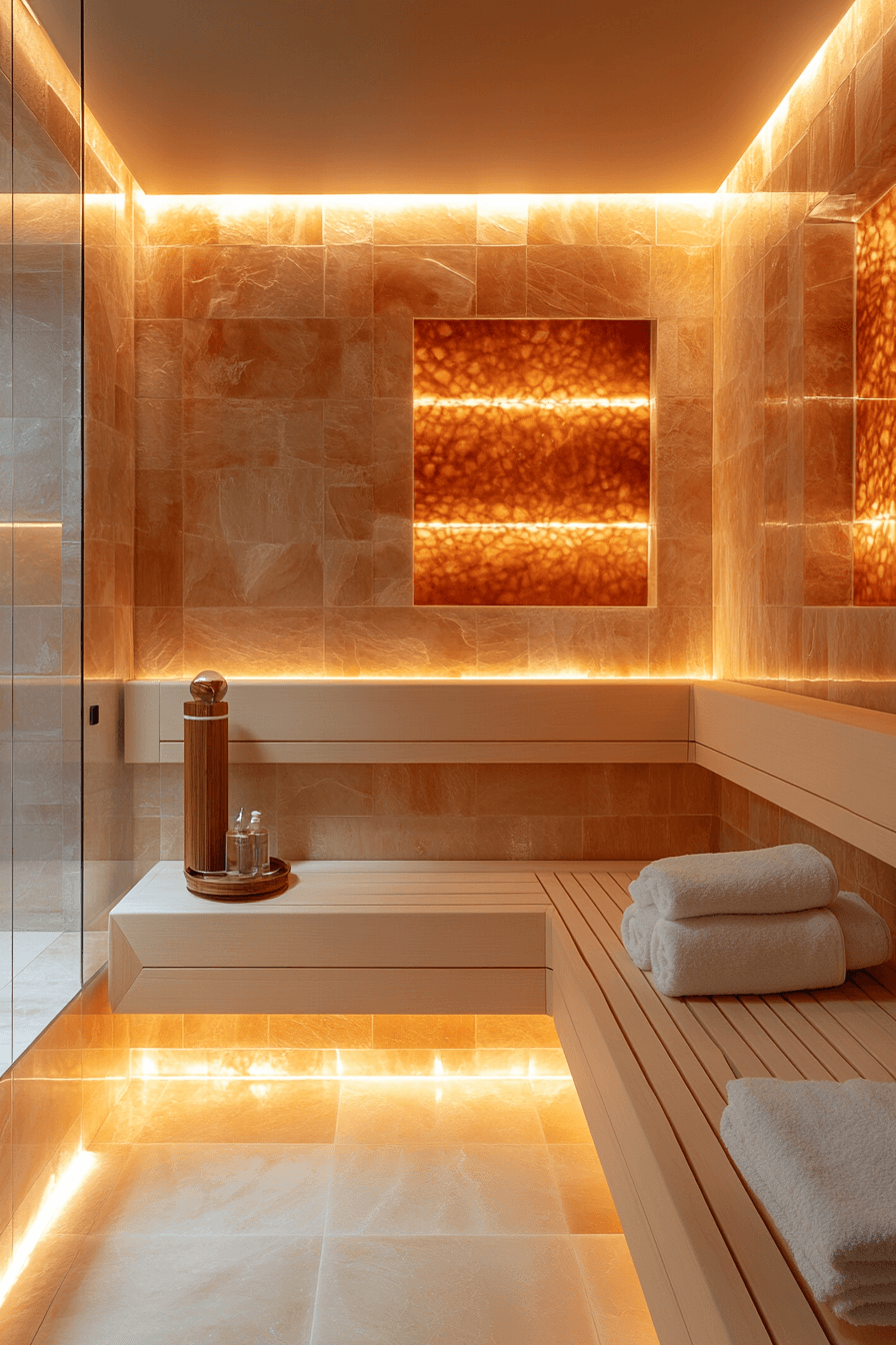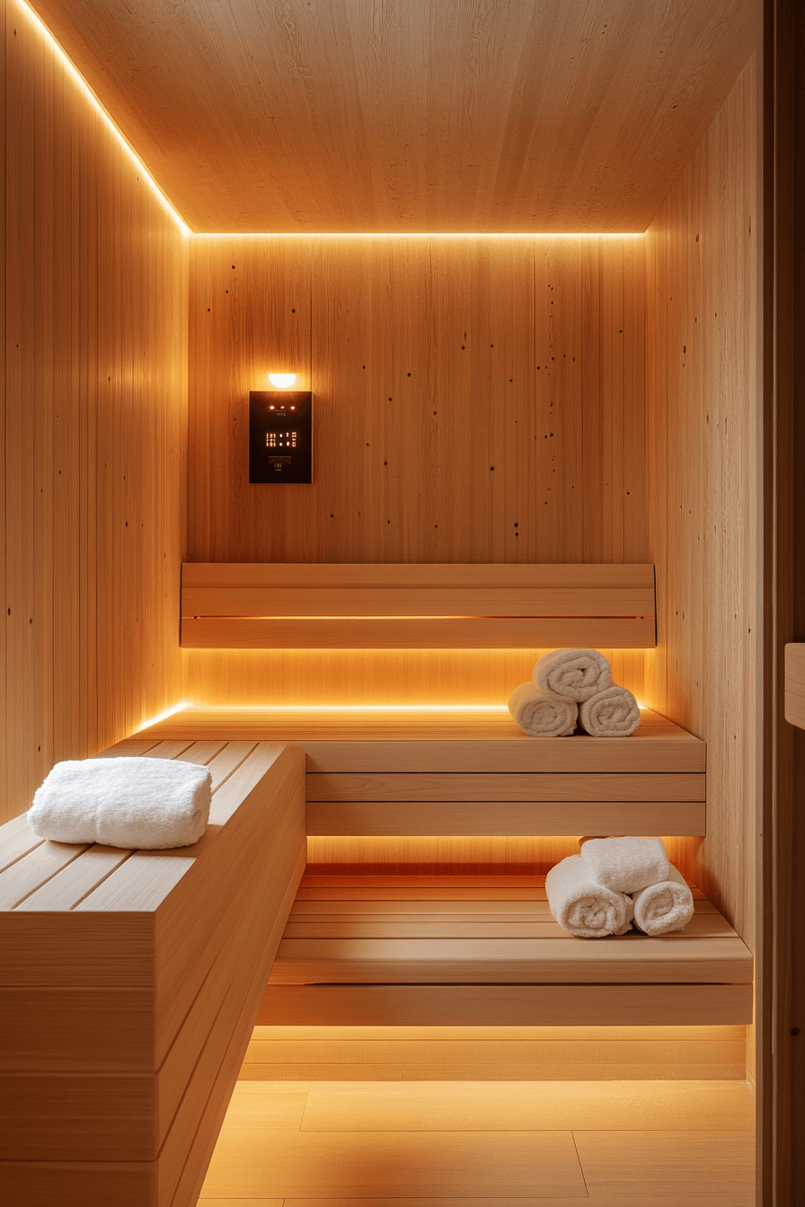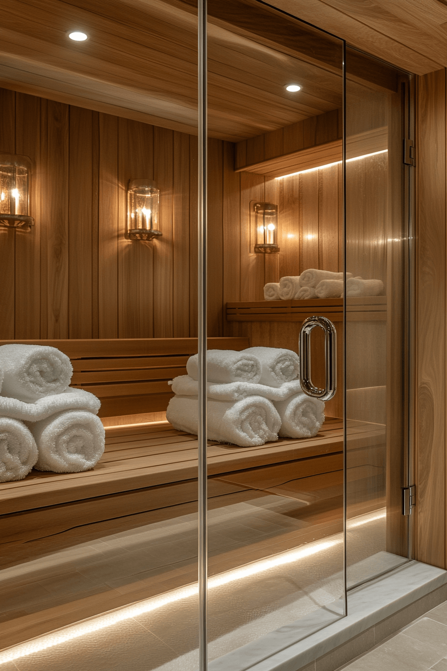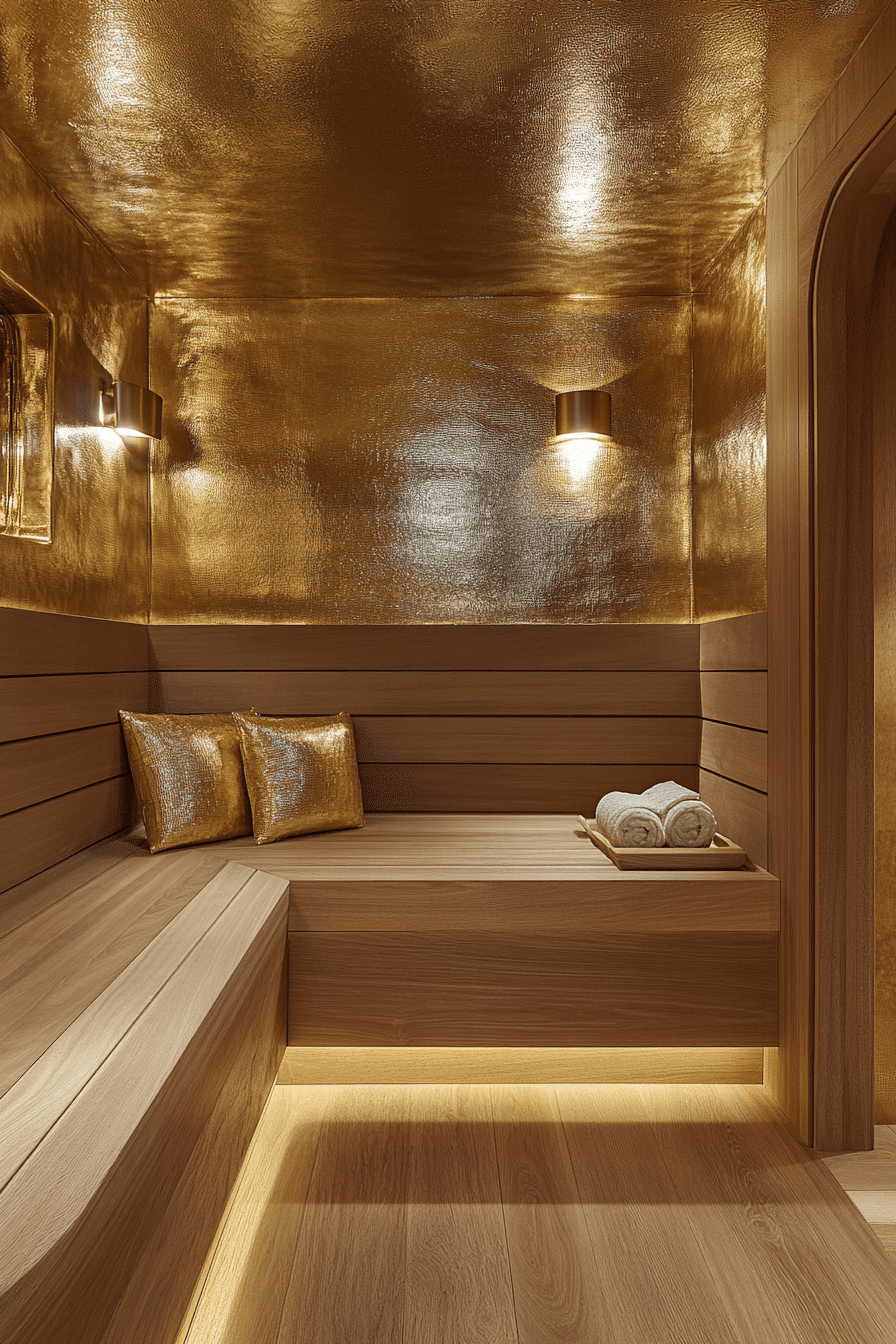 Touches of gold introduce a sense of luxury to elevated sauna ideas that feel warm and indulgent. Metallic accents paired with darker woods or stone create a rich, inviting contrast. The glow of gold details enhances the ambiance while maintaining a calming environment. This style blends wellness with high-end design for a truly sophisticated experience. These sauna ideas are perfect for anyone wanting a spa-like escape with a glamorous edge. Step into a more luxurious experience with gold-accent sauna ideas.