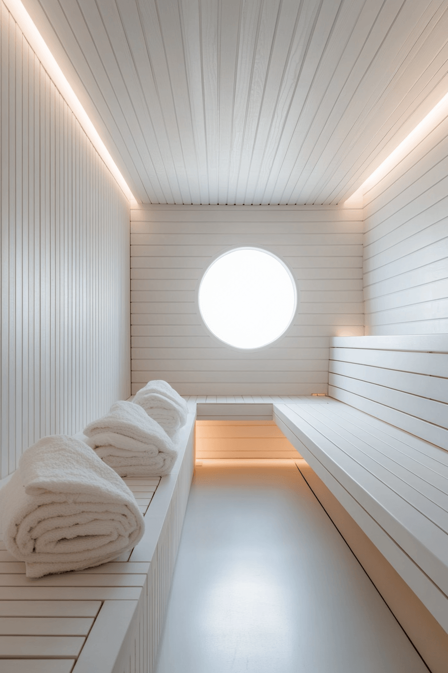 Bright interiors create calming sauna ideas that feel clean, open, and serene. White finishes reflect light beautifully, making the space feel larger and more peaceful. Minimal decor keeps the focus on relaxation and simplicity. Sleek lines and uncluttered layouts enhance the tranquil vibe. These sauna ideas are perfect for creating a quiet escape from daily stress. Refresh your space with minimalist white sauna ideas designed for total calm.