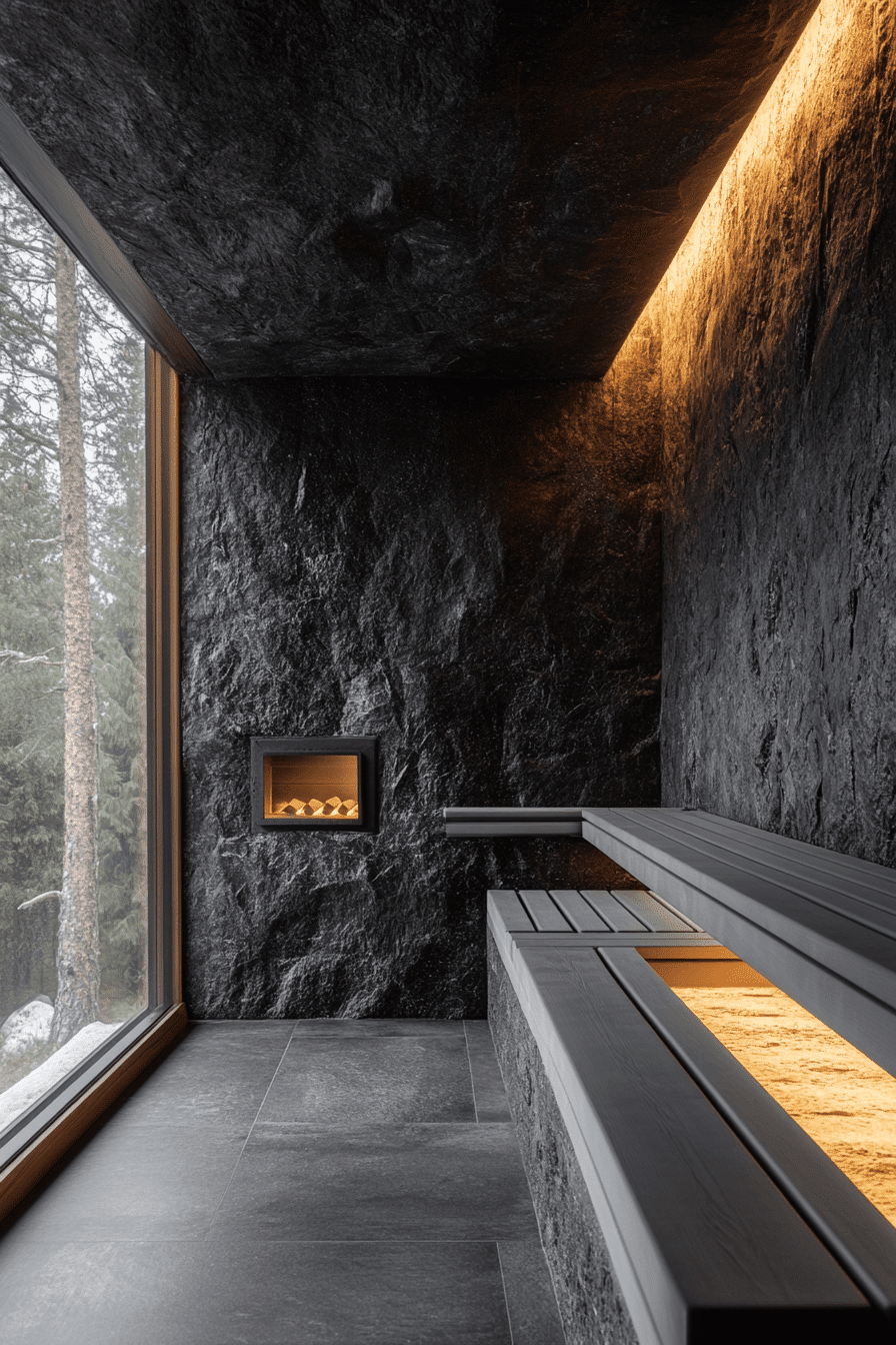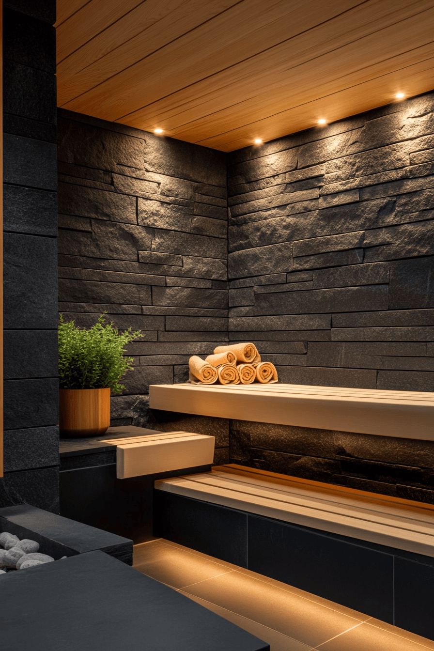 Dark stone finishes create a bold, modern atmosphere in striking sauna ideas that feel both sleek and calming. Black stone surfaces not only look dramatic but also retain heat efficiently for a consistent experience. Subtle chromotherapy lighting can be added to introduce color-based relaxation and mood enhancement. Clean lines and minimal fixtures keep the design refined and uncluttered. These sauna ideas blend contemporary style with traditional heat therapy for a truly elevated retreat. Discover how black stone sauna ideas can redefine your relaxation space.