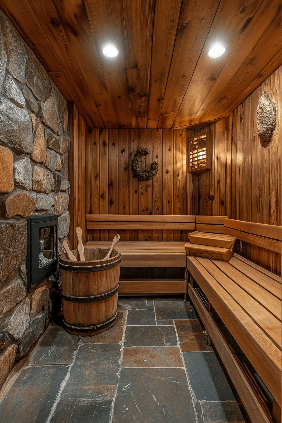 Warm, natural textures bring timeless charm to cozy sauna ideas inspired by rustic cedar design. Cedar wood fills the space with a comforting aroma while offering durability in high heat and moisture. Rugged benches and traditional heaters create an authentic, cabin-like feel. The wood’s natural insulation helps maintain warmth efficiently and sustainably. These sauna ideas celebrate nature while delivering a relaxing and inviting environment. Explore how cedar-inspired sauna ideas can bring rustic comfort into your space.