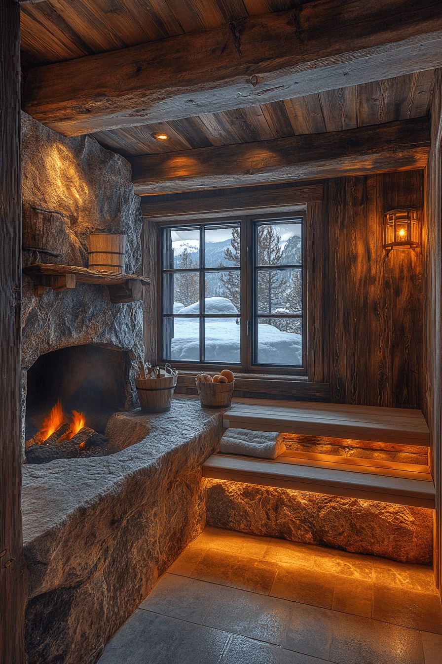 A mountain-inspired escape comes to life with cozy sauna ideas rooted in alpine design. Rough wood textures, stone details, and exposed beams create a warm, lodge-like atmosphere. Sloped ceilings and natural materials mimic the charm of a traditional cabin retreat. Heated stones provide a gentle, comforting warmth that complements the rustic setting. These sauna ideas are perfect for recreating the feeling of a peaceful getaway at home. Step into alpine-inspired sauna ideas and bring mountain tranquility indoors.