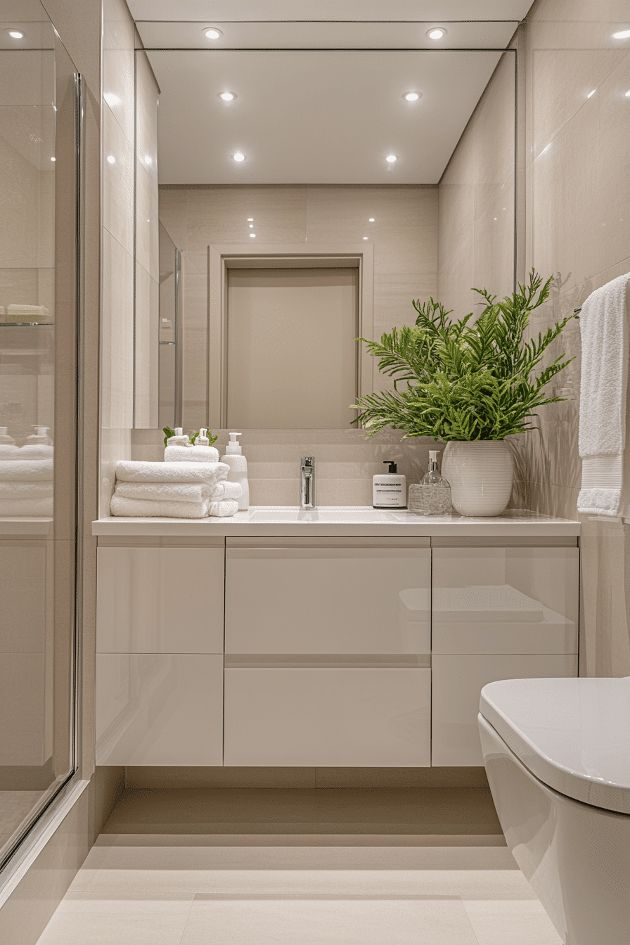 If you want your space to feel brighter and more open, small bathroom ideas that use high-gloss finishes are a great option. Shiny cabinets and reflective tiles bounce light around the room, making everything feel larger than it actually is. When paired with well-placed lighting, the effect becomes even more noticeable and energizing. This look gives your bathroom a clean, polished vibe that feels fresh and modern. It’s a simple way to upgrade a compact space without major changes. Take a closer look at more small bathroom ideas using high-gloss finishes!