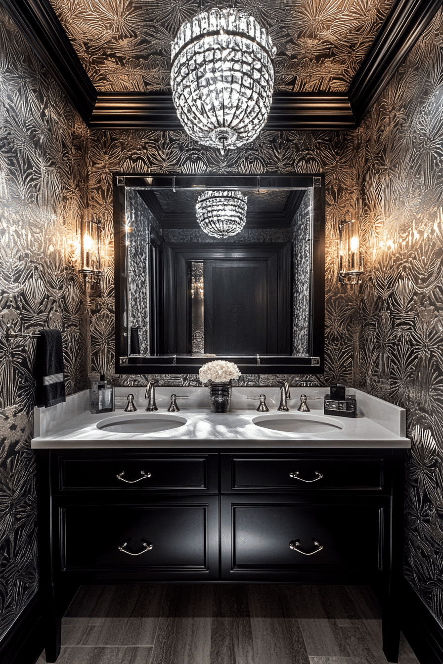 If you love a bit of glamour, small bathroom ideas inspired by Art Deco style offer a unique twist. Geometric patterns, clean lines, and metallic finishes create a bold yet refined look. Black and white tiles paired with chrome details give that signature vintage-inspired feel. Mirrors with decorative edges and sleek lighting add extra sophistication. It’s a stylish blend of classic design and modern simplicity. Take a peek at more small bathroom ideas with Art Deco influence!