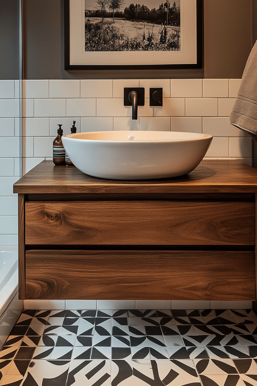 Bold patterns can bring life to a compact space, and small bathroom ideas with geometric tiles do exactly that. Whether on the floor or walls, these patterns create movement and visual interest. You can go bold with contrast or keep it subtle with softer tones. The key is balancing it with simple fixtures so the space doesn’t feel overwhelming. It’s a fun way to add personality without sacrificing style. Get inspired by small bathroom ideas that feature geometric tile designs!