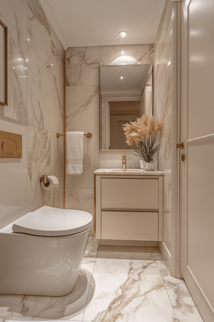 There’s something timeless about marble, and it works beautifully in small bathroom ideas that aim for a more elevated look. The natural veining adds just enough detail to keep things interesting without overwhelming the space. Pairing it with sleek fixtures in chrome or brass brings in a touch of understated luxury. Glass shower panels and recessed shelves help maintain that open, airy feel. It’s a simple way to make a compact bathroom feel more refined. Get inspired by more small bathroom ideas featuring marble finishes!