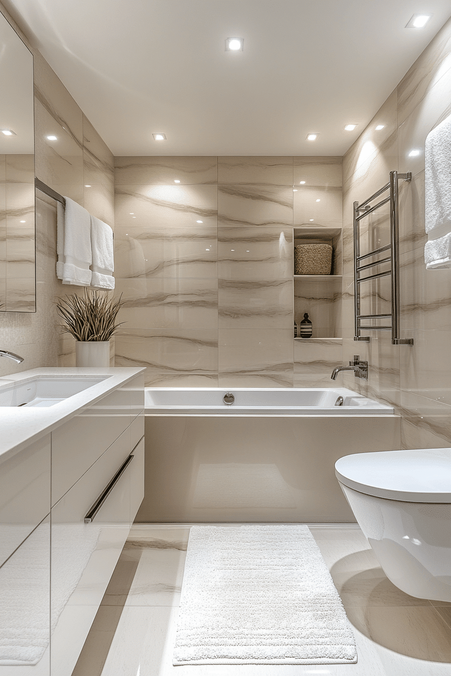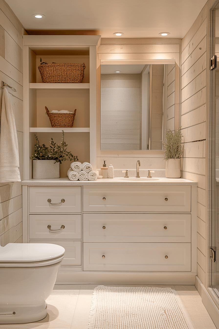You don’t need a huge space to enjoy a touch of luxury, especially with small bathroom ideas that focus on high-end details. Finishes like brushed gold fixtures or custom cabinetry can instantly elevate the look. A compact soaking tub or rainfall shower adds that extra bit of indulgence. Soft lighting and cozy textiles help complete the upscale feel. It’s all about choosing the right elements that make the space feel special. Discover more small bathroom ideas that bring luxury into smaller spaces!
